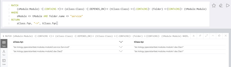 Das festgesetzte Regelwerk kann beispielsweise auch automatisiert zur Architekturvalidierung in den Build-Prozess eingebaut werden. Die Darstellung erfolgt über einen Browser, in dem Abfragen gestartet werden können sowie die Ergebnisse grafisch und tabellarisch dargestellt werden.