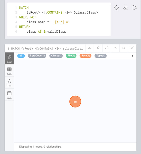 Es gibt viele nützliche Tools, die für ein Code Review benutzt werden können. Eines davon ist jQAssistant, welches unter der GNU General Public License in der Version 3 veröffentlicht wurde. jQAssistant übernimmt die Struktur des kompilierten Codes in die Graphdatenbank Neo4j. Bei Neo4j handelt es sich um eine Datenbank-Engine, die Daten in Graphen visualisiert und abspeichert. Als Knoten in der Visualisierung werden zum Beispiel Klassen oder Interfaces angelegt. Die Kanten stellen die Beziehungen zwischen den Knoten dar (implements, contains, …). Die in Neo4j verwendete Abfragesprache ist Cypher, welches eine einfache Formulierung von komplizierten Datenbankabfragen ermöglicht. Cypher beruht auf dem Property-Graph-Modell. In dem Property-Graph-Modell werden die Graphen, welche normalerweise als eine Menge von Knoten und Kanten definiert sind, um Etiketten und Eigenschaften ergänzt. Jeder Knoten kann eine oder mehrere Etiketten haben und jede Kante besitzt genau ein Etikett. Etiketten beschreiben den Typ eines Knotens oder einer Kante. Sowohl Knoten als auch Kanten können keine oder mehrere Eigenschaften haben.